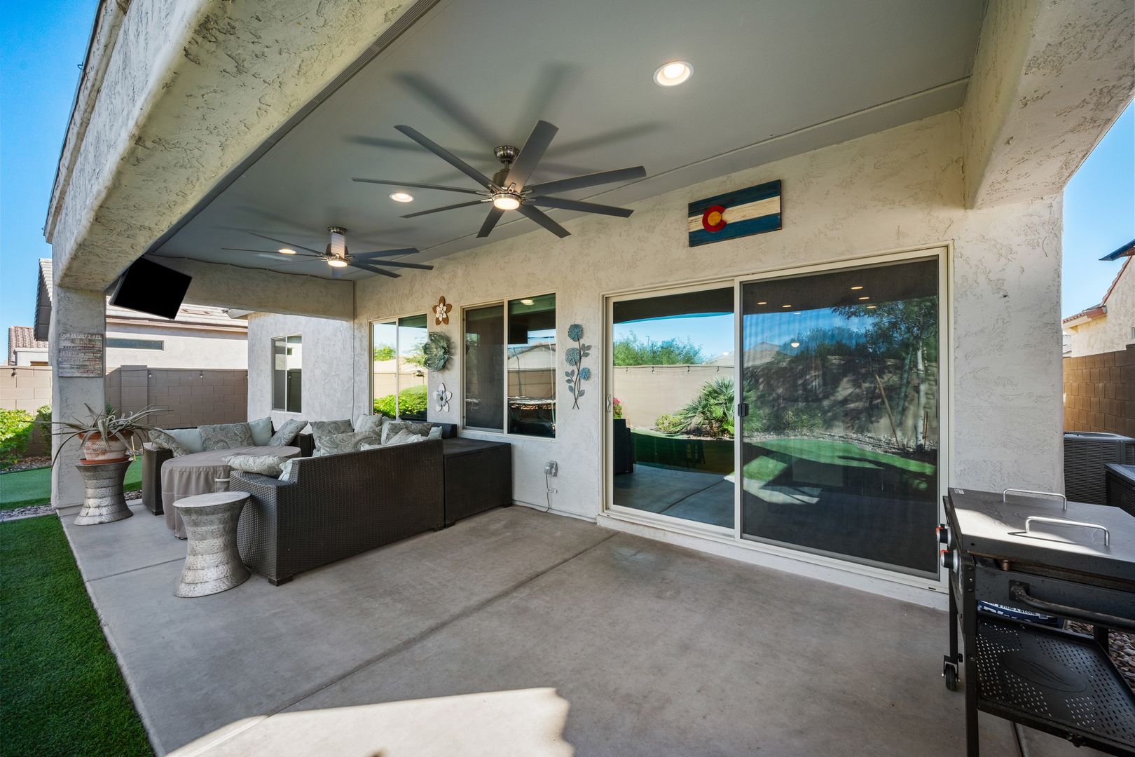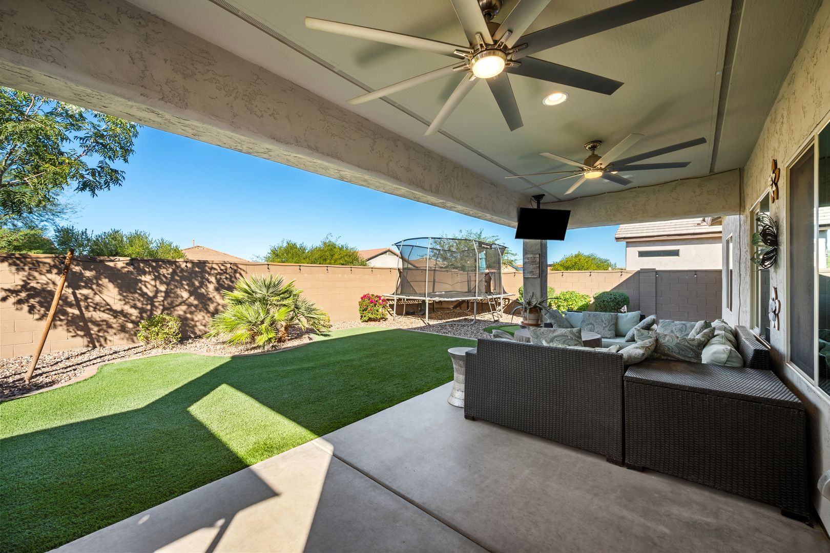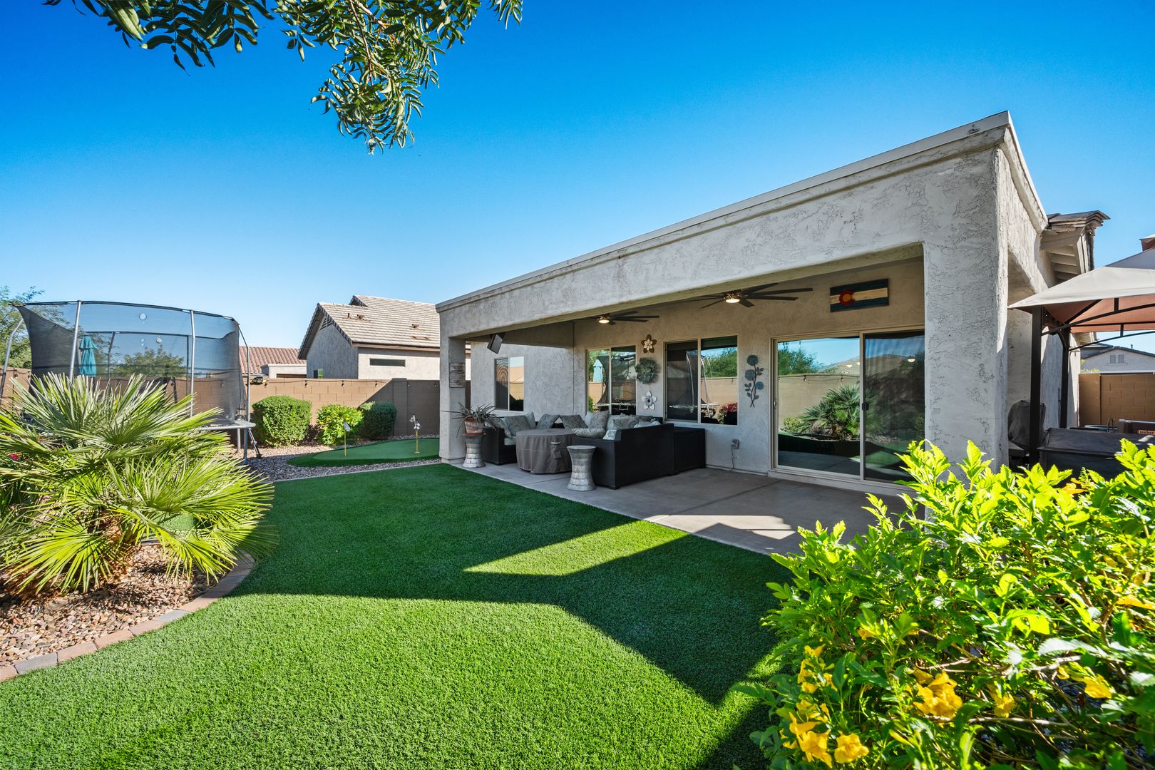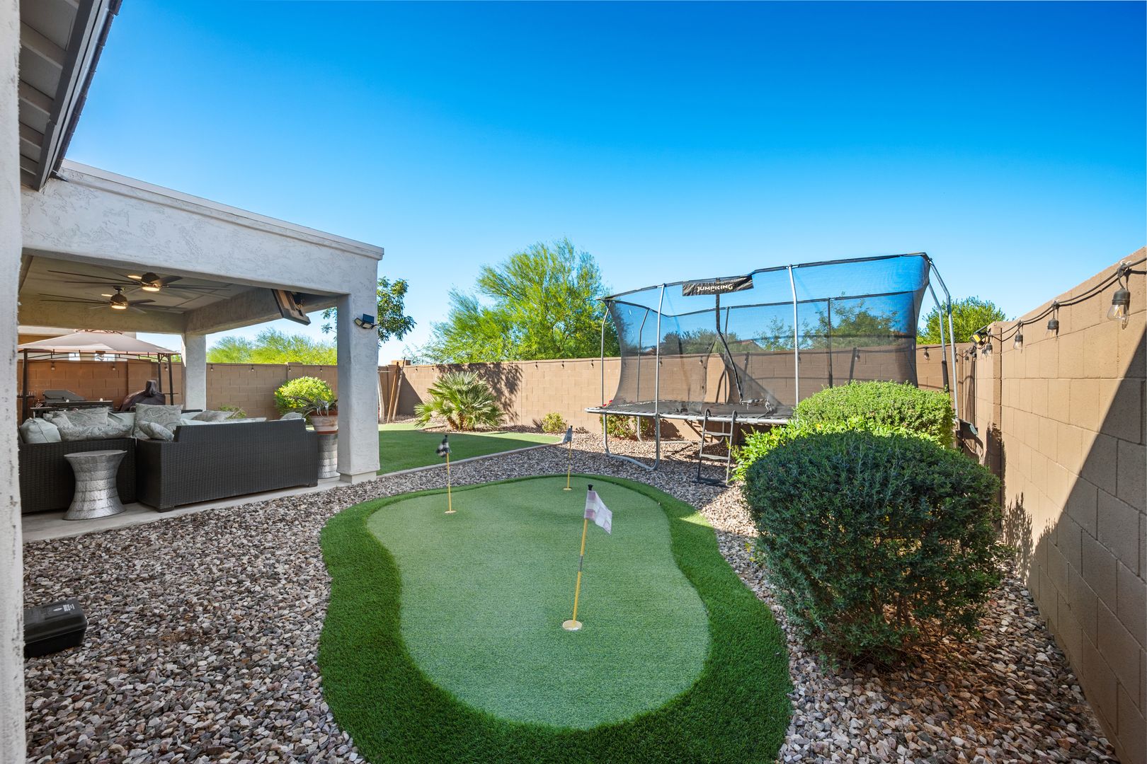 Luxurious 3 Bed, 2 Bath Rental - Rare Gem, Won't Last! Packed with premium upgrades and bathed in natural light, this modern masterpiece offers a lifestyle of luxury and comfort. High ceilings and a spacious open floor plan. Gourmet kitchen with Whirlpool stainless steel appliances, including a gas stove and microwave. The primary suite features beautiful windows and a spacious walk-in closet. Outdoor oasis features a lush, private retreat backing to a walking path with no visible neighbors. Enjoy an extended patio, double ceiling fans, and a 3-hole putting green—perfect for stargazing, vibrant sunsets, or hosting gatherings. Resort-Style Community Amenities including: Poston Butte Golf Course, lap pool, diving pool, and Big Splash Water Park with thrilling slides and a splash park.
